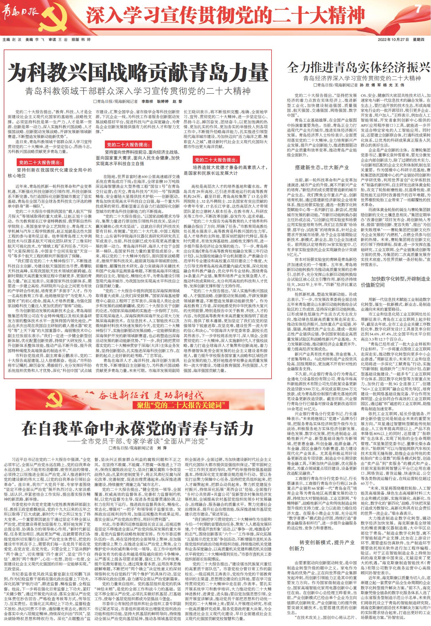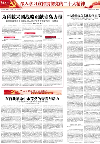 连日来,青岛科教领域干部群众深入学习宣传贯彻党的二十大精神,进一步坚定信心、昂扬斗志,为科教兴国战略贡献更多青岛力量。