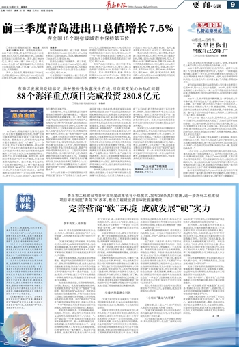 民营企业进出口比重提升。前三季度,青岛市民营企业进出口4612.6亿元,增长12.1%,占全市进出口总值的69.3%,占比较去年同期提升2.9个百分点;国有企业进出口863.4亿元,增长10.2%。