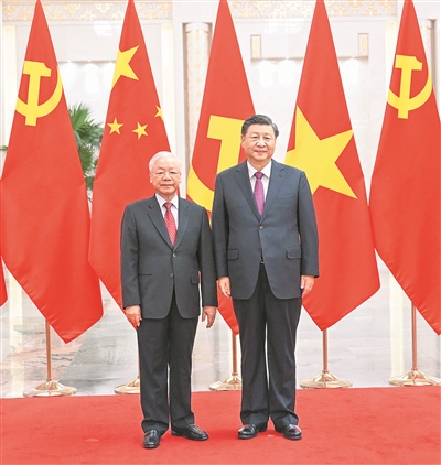 习近平指出,中越是山水相连、唇齿相依的好邻居、好朋友,是志同道合、命运与共的好同志、好伙伴,是致力于人类和平与进步事业的命运共同体。在两国推进社会主义现代化建设征程上,中国共产党愿同以阮富仲总书记为首的越南共产党一道,传承好毛泽东、胡志明等两党两国老一辈领导人亲手缔造和精心培育的传统友谊,共同引领中越关系取得更大发展。