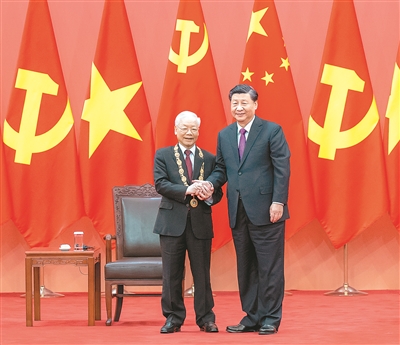 习近平发表讲话。习近平指出,阮富仲总书记是坚定的马克思主义者,是中国共产党的亲密同志和真诚朋友。在阮富仲总书记高度重视和亲自推动下,中越两党两国传统友谊得到巩固,政治互信不断增强,务实合作持续深化,交流互鉴日益密切。“友谊勋章”代表了中国共产党和中国人民对阮富仲总书记和越南人民的友好感情,象征着中越“同志加兄弟”的深厚情谊,蕴含着两党和两国人民共同追求美好未来的殷切希望。