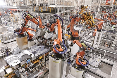 ■汽车产业新城一汽—大众汽车有限公司青岛分公司,智能机械手在焊接车身底板。