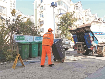 ■在市北区太康家园,环卫工人进行垃圾收运。