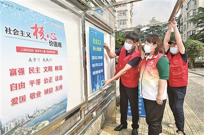 ■敦化路街道伊春路社区网格更新宣传标语,营造良好氛围。 崔冬妮 摄