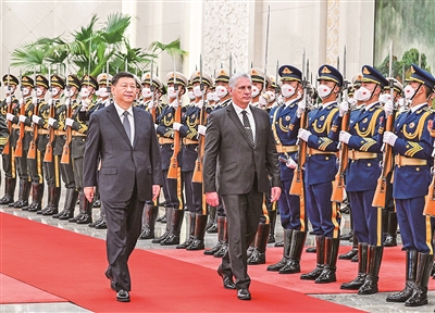 习近平指出,你是中共二十大后首位访华的拉美和加勒比国家元首,充分体现了中古两党两国的特殊友好关系。古巴是西半球第一个同新中国建立外交关系的国家,中古关系成为社会主义国家团结合作、发展中国家真诚互助的典范。中方愿同古方不断深化政治互信,拓展务实合作,在涉及彼此核心利益问题上坚定相互支持,在国际和地区事务中加强协调配合,在建设本国特色社会主义道路上携手并进,不断深化新时代中古关系。