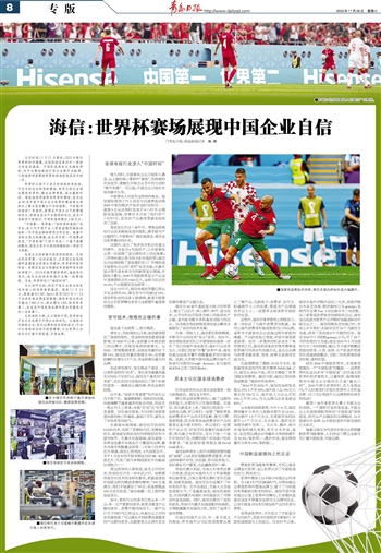世界杯从来不只是足球劲旅的竞技场。作为足球运动的顶级赛场,有实力的企业通过赞助世界杯,输出品牌形象,展示最新科技。海信连续两届亮相世界杯赛场,成为过去40多年里中国企业从世界杯赛场观众席到走上舞台甚至舞台中央的缩影。不断刷屏的海信广告围挡,展现出中国企业不断增强的实力,折射出显示产业格局的变迁,成为中国经济不断前行、中国制造顽强向上的见证。