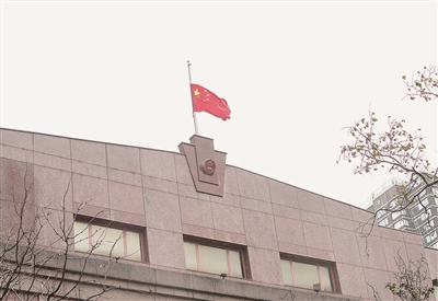 ■11月30日,中国常驻联合国代表团驻地下半旗志哀,悼念江泽民同志逝世。 新华社照片