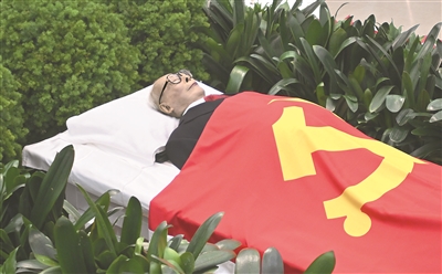 12月5日,江泽民同志的遗体安卧在鲜花翠柏丛中,身上覆盖着鲜红的中国共产党党旗。 新华社照片