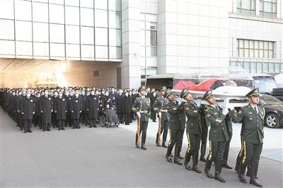 10时20分,8名礼兵荷灵,伴着哀乐缓缓走出告别室。习近平等护送江泽民同志的遗体上灵车。
