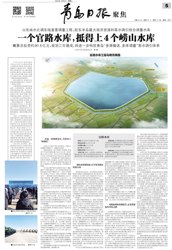 党的二十大报告提出,“优化基础设施布局、结构、功能和系统集成,构建现代化基础设施体系”。官路水库是国家大水网的重要节点工程,也是胶东半岛最大的雨洪资源和客水调引综合调蓄水库。规划总库容2.11亿立方米,与4个崂山水库大体相当,年调蓄水量可达6亿立方米,建成后将成为青岛的主要水源地,可进一步构筑青岛“多渠输送、多库调蓄”客水调引体系,大大提升青岛乃至胶东半岛的水资源统筹调配、供水保障和战略储备能力。