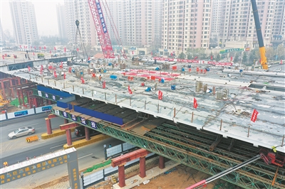 记者在项目建设现场看到,距离地面十几米的深圳路节点桥上,近百名工人系着安全带,挥动焊枪,伴随着“嗞嗞嗞”的焊接声,一时间金黄色的焊花此起彼落,火热施工的场面甚是壮观。