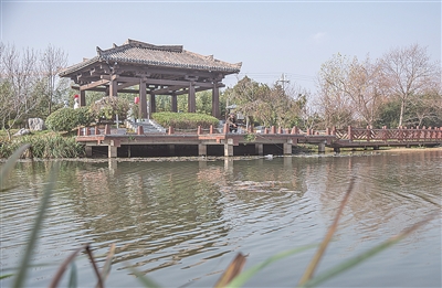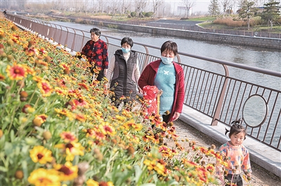 ■市民在城阳区虹字河滨水廊道漫步。 刘 栋 摄