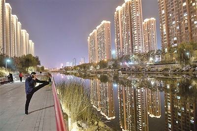 ■黄昏后,市民在华灯初上的李村河畔休闲健身。 赵健鹏 摄