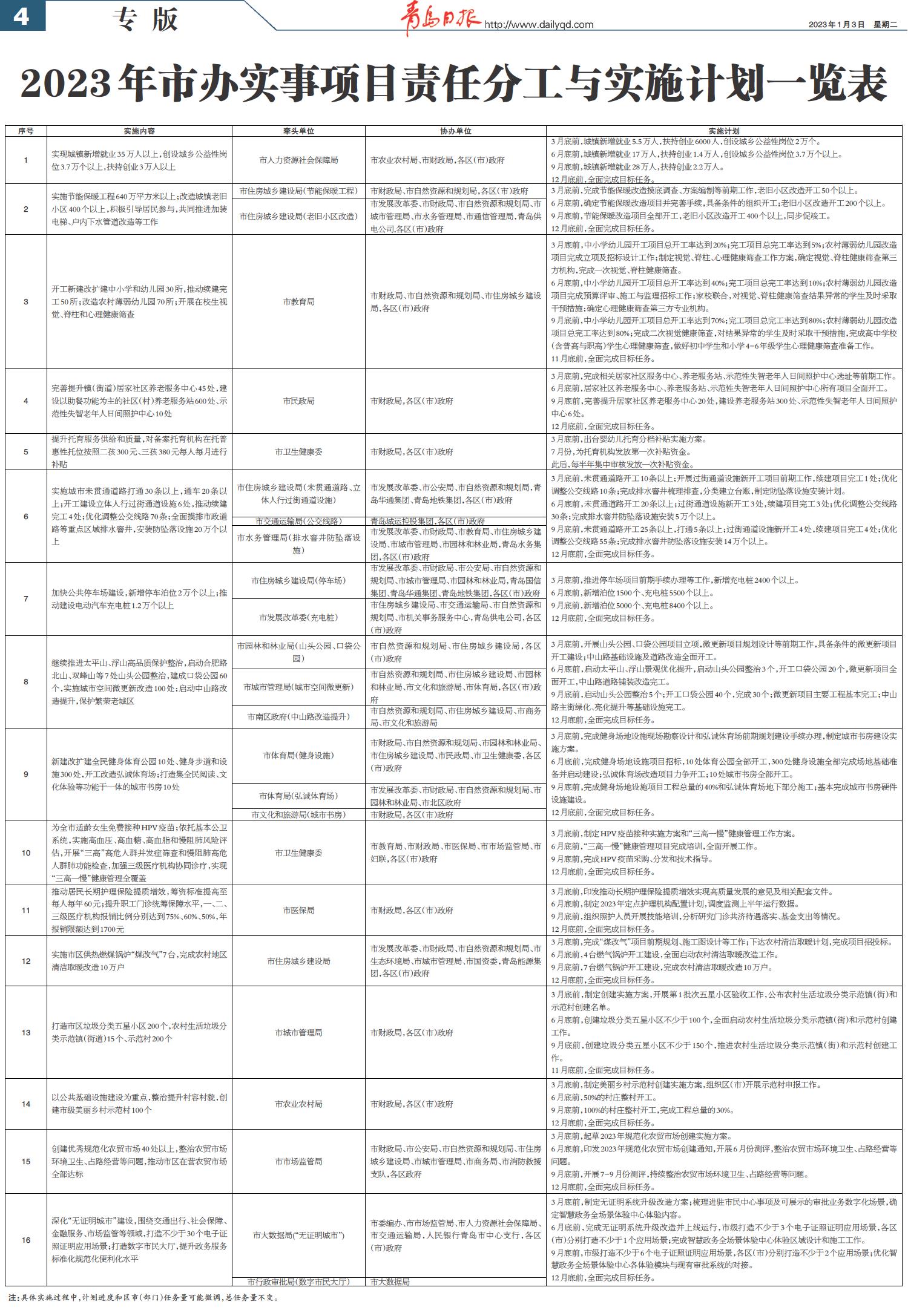 2023年市办实事项目责任分工与实施计划一览表