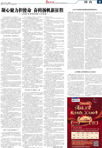 一年来,宣传思想战线心怀“国之大者”、坚持守正创新,紧紧围绕迎接、宣传、贯彻党的二十大这条主线,以愈加饱满的精神状态,同心唱响时代奋进凯歌,汇聚起亿万人民团结奋斗、勇毅前行的磅礴力量。