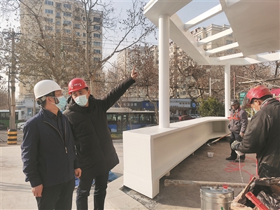 ■市北区城建局城市更新发展中心主任梁学建(左)在人民路、嘉定路口袋公园现场了解项目进展情况。 余瑞新 摄