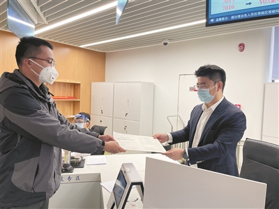 ■市行政审批局青年尖刀班成员张修铭(右)为企业办理业务。 余 博 摄