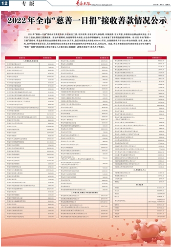 2022年“慈善一日捐”活动由市委宣传部、市直机关工委、市民政局、市退役军人事务局、市国资委、市工商联、市慈善总会联合倡议发起,于5月20日启动,目前已圆满结束。活动开展期间,各级领导带头捐款,社会各界积极参与,充分彰显了慈善青岛的城市精神。在2022年的“慈善一日捐”活动中,青岛市慈善总会共接收善款2038.26万元,各区市慈善会共接收4058.43万元,全部捐款将用于2023年全市助困、助医、助老、助残、助学等慈善救助项目,具体使用计划拟在青岛市慈善总会理事大会审核批准后,另行公布。在此,青岛市慈善总会代表全市受助群体向参与“慈善一日捐”活动的爱心单位和爱心人士表示衷心的感谢!具体名单如下(排名不分先后):