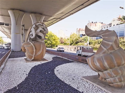 ■新冠高架桥下绿化植物枯萎被曝光后,相关部门进行了硬质景观改造,换成了别致的雕塑。
