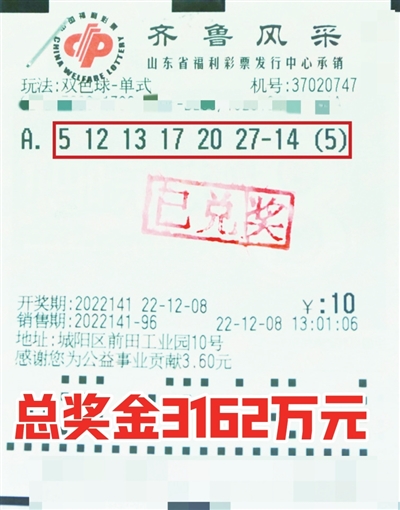 2022年12月8日晚的双色球第2022141期开奖中,全国共开出21注头奖,单注奖金6324820元,山东揽获5注头奖,全部花落青岛市城阳区前田工业园10号网点的福彩37020747销售站,中奖彩票为一张投注额10元的5注号码的双色球自选单式彩票,共中得5注头奖,奖金合计3162万余元,位列全年奖金榜第一名。