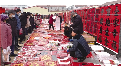 ①张烟大集上,对联琳琅满目,顾客在认真挑选。