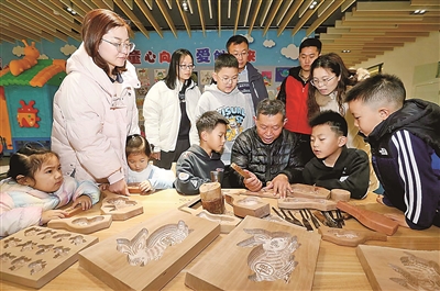 ②“我们的中国梦”——文化进万家走进社区开展“手艺迎新春 年味有传承”活动。图为即墨区龙山街道民间子艺人王承厚向小朋友展示刻制兔子图案的子。