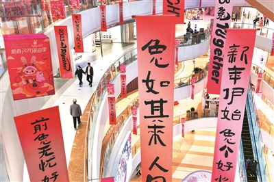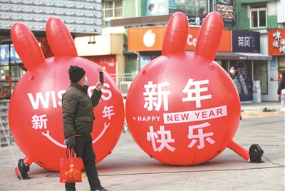 ■四流南路一家商场挂起迎接农历兔年的条幅。赵健鹏 摄