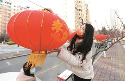 ■河西街道长沙路社区工作人员在小区挂上灯笼,迎接春节。 韩 星 摄