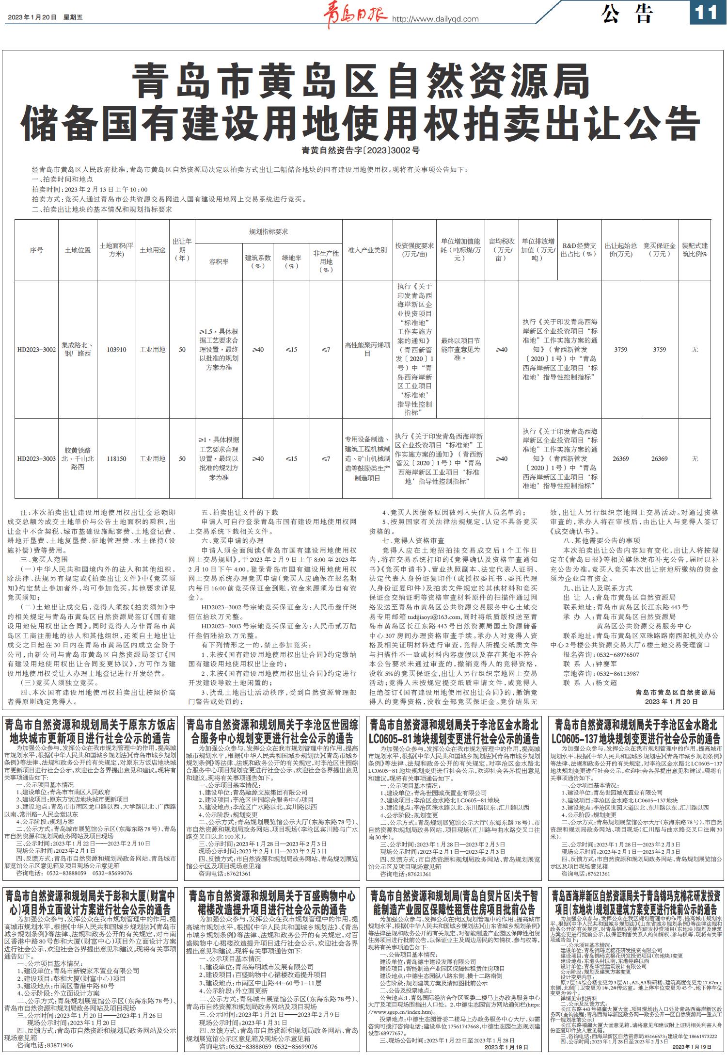 青岛市黄岛区自然资源局储备国有建设用地使用权拍卖出让公告