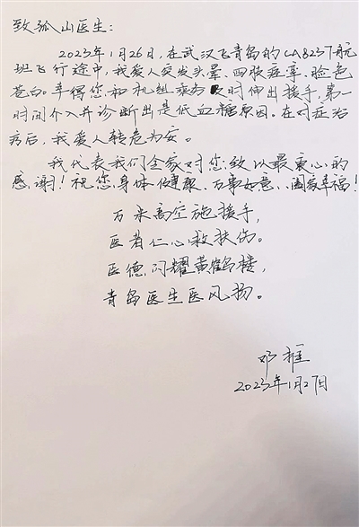 “万米高空施援手,医者仁心救扶伤,医德闪耀黄鹤楼,青岛医生医风扬。我代表我们全家对您致以最衷心的感谢。”邓先生在感谢信上写道。他希望能亲手将感谢信交给这名带给他全家温暖的“孤山”医生。