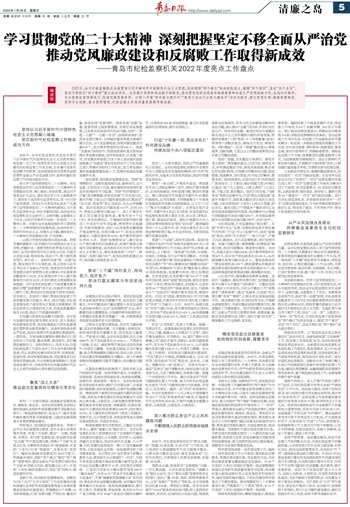 深入学习宣传贯彻党的二十大精神。市纪委常委会把学习宣传贯彻党的二十大精神作为首要政治任务,精心组织、周密部署,通过召开常委会扩大会议、组织理论学习中心组集体学习、领导班子成员带头宣讲等形式,第一时间学习宣传贯彻。印发《中共青岛市纪委关于认真学习宣传贯彻党的二十大精神的通知》,召开委机关宣讲报告会,举办专题培训班,推动全市纪检监察机关在全面学习、全面把握、全面落实上下功夫,切实把思想和行动统一到党的二十大精神上来。加强对全市各级党组织学习贯彻党的二十大精神情况的监督检查,坚决纠治学习贯彻中的形式主义、官僚主义问题,确保党的二十大精神在青岛落地生根、开花结果。