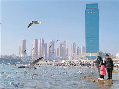 ■2月5日元宵佳节,沿海一线,成群的海鸥翩翩起舞似“精灵”,市民游客纷纷与海鸥同框留念。 梁 超 摄影报道