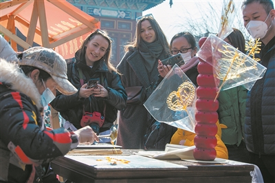 ■2月5日,青岛天后宫举行了丰富多彩的闹元宵活动,传统的糖画技艺受到外国游客的青睐。 于 滈 摄影报道