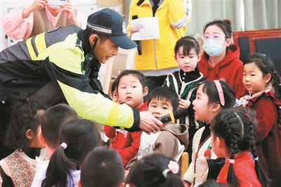 ■2月6日,交警李沧大队走进武川路幼儿园,在欢声笑语中开展交通安全授课。开学首日,青岛公安走进中小学校园,为学校师生送上“平安礼”。 梁 超 摄影报道