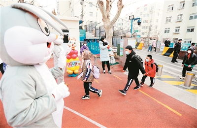 本报2月6日讯 6日,岛城百万中小学生开启了新学期。这是疫情防控回归“乙类乙管”后的首个新学期。卡通兔子在校门口欢快地迎接学生,社区的锣鼓队在校门口一字排开为学生加油鼓劲,老师们用“发红包”的方式把新春的喜悦带给学生……久违的热闹回归校园,教育工作者也更加奋力让青岛基础教育优质资源倍增的规划全面落实。