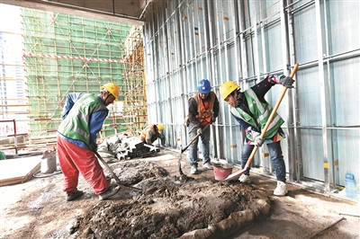 两座塔吊巍然耸立,有序运送着钢筋、混凝土等原材料;四五辆挖掘机和铲车在工地上不停地穿行;200余名工人奋战在各自的施工点位上,搬运钢材、调试机器、焊接埋板……眼下,青岛滨海国际中心项目施工现场正是一派火热景象。
