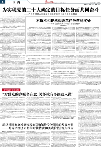 党的二十届二中全会审议通过了在广泛征求意见的基础上提出的《党和国家机构改革方案》,习近平总书记就《党和国家机构改革方案(草案)》向全会作了说明。这是以习近平同志为核心的党中央从党和国家事业发展全局出发,着眼新的使命任务、新的战略安排、新的工作需要,作出的重大决策部署,必将有力推动党对社会主义现代化建设的领导在机构设置上更加科学、在职能配置上更加优化、在体制机制上更加完善、在运行管理上更加高效,对于全面建设社会主义现代化国家、全面推进中华民族伟大复兴意义重大而深远。