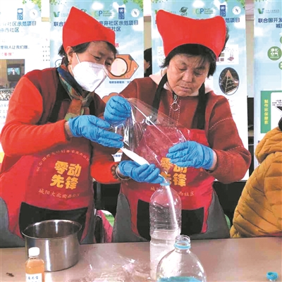 ■大北曲西社区居民在学习用果皮、废油脂制作酵素和香皂。
