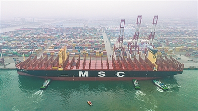 全球最大集装箱船“地中海伊琳娜”号首航山东港口青岛港。