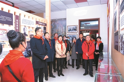 ■日前,由青岛市关工委、青岛市文明办、共青团青岛市委、青岛市教育局、青岛市少工委联合主办的“弘扬雷锋精神 争做新时代好队员”青岛市学雷锋主题教育活动暨青少年“红色大讲堂”在城阳区白云山学校举行。图为青岛市关工委等主办单位和有关方面负责同志参观青岛市城阳区白云山学校打造的红色教育基地—城阳武工队展馆。