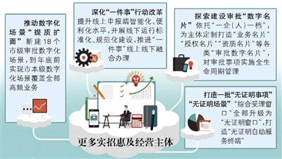 推动数字化场景“提质扩面”,新建18个市级审批数字化场景,到年底前实现市本级数字化场景覆盖全部高频业务;推动数字化服务向区市延伸覆盖。深化“一件事”行动改革,提升线上申报端智能化、便利化水平,开展线下运行标准化、规范化建设,推进“一件事”线上线下融合办理。探索建设审批“数字名片”,依托“一企(人)一档”,为主体定制打造“业务名片”“授权名片”“资质名片”等各类“审批数字名片”,对审批事项实施全生命周期管理。