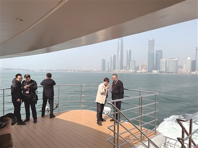 ◀体验团成员在游轮上“打卡”青岛沿海风光。
