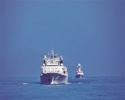 中国海军第42批护航编队综合补给舰可可西里湖舰(前)和导弹护卫舰日照舰(后)在机动航行(2023年2月8日摄)。新华社照片