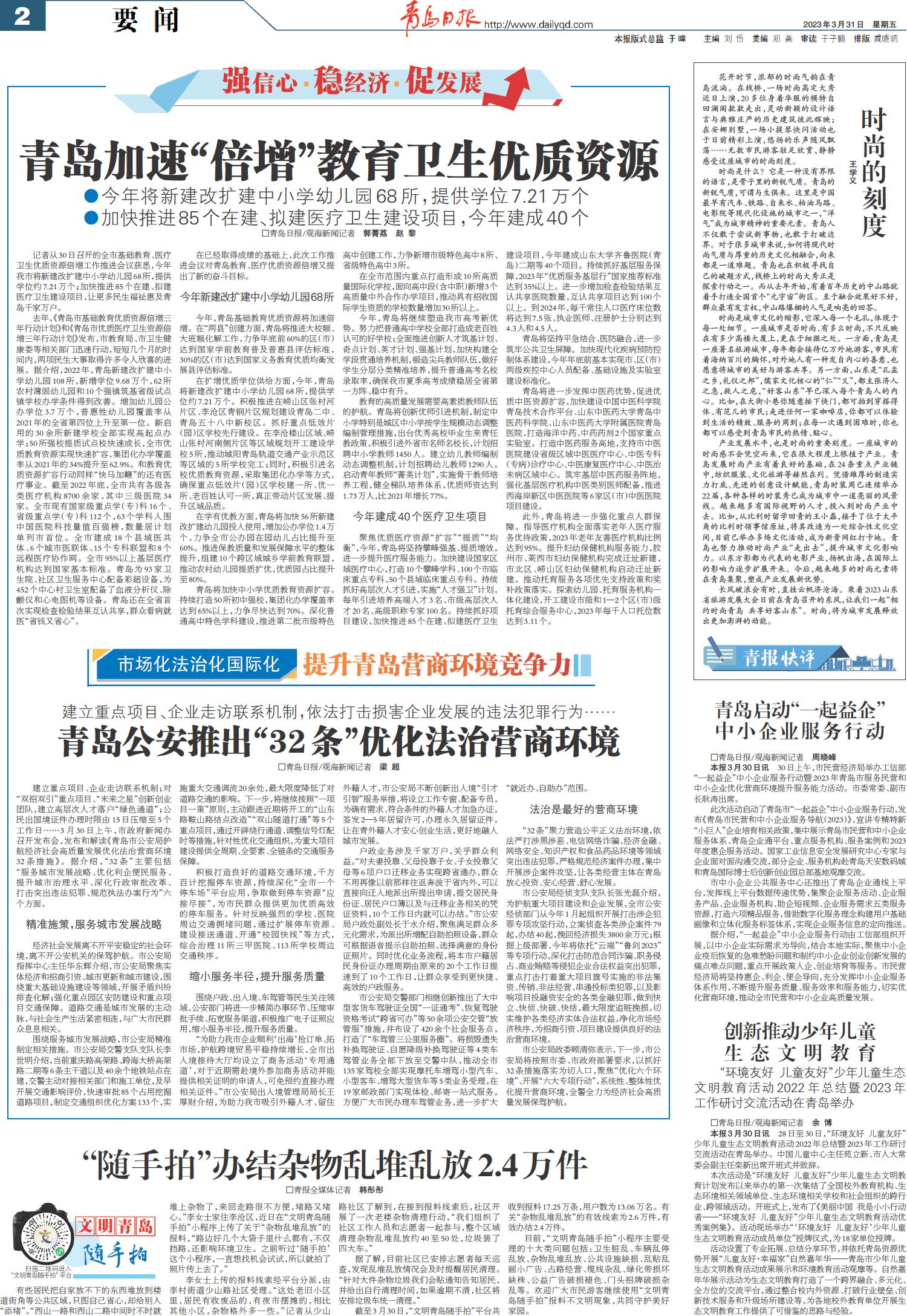 记者从30日召开的全市基础教育、医疗卫生优质资源倍增工作推进会议获悉,今年我市将新建改扩建中小学幼儿园68所,提供学位约7.21万个;加快推进85个在建、拟建医疗卫生建设项目,让更多民生福祉惠及青岛千家万户。
