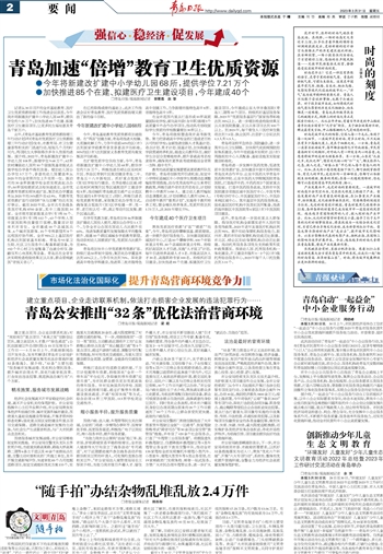 今年,青岛基础教育优质资源将加速倍增。在“两县”创建方面,青岛将推进大校额、大班额化解工作,力争年底前60%的区(市)达到国家学前教育普及普惠县评估标准,30%的区(市)达到国家义务教育优质均衡发展县评估标准。