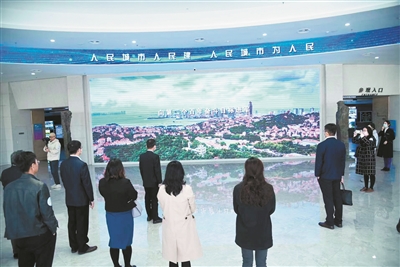■“游子青岛行”返乡考察活动中,企业家代表透过大屏幕了解家乡变化。