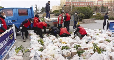 ■北安街道“红蜂志愿者”与“社区一线党旗红”共建单位报到党员在疫情期间为隔离封闭的小区居民分拣超市物资。