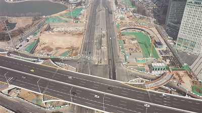 目前进度最快的是东北象限的施工:地下,停车场部分的主体结构施工已经完成,接下来将进入内部回填土及地面、管线安装等工程施工;地上,一条匝道桥从主桥上蜿蜒延伸下来,匝道桥由一段装配式钢结构桥体和一段混凝土现浇桥体组成。