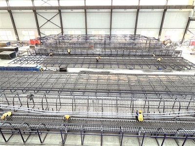 “这里正在加紧生产的,就是重庆路快速路的箱梁构件。”近日,记者在位于青岛高新区的青岛城铁智能建造科技有限公司车间内看到了一片火热朝天的生产景象:敞亮的现代化生产车间内,伴随着或高或低的轰鸣声和切割声,8条智能化流水生产线开足马力,钢筋笼绑扎、混凝土浇筑、蒸汽养护……每完成一道工序后,移动台车便会载着逐渐成型的箱梁,顺着轨道移动到下一个工区,一批批“重量级产品”相继完成。