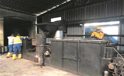 ■大件垃圾处置厂的工作人员利用专业设备将木屑制作成生物炭和木醋液。