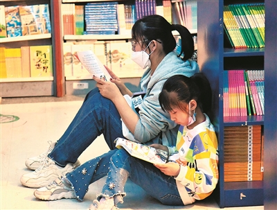 ■在青岛书城,一位小朋友和妈妈一起席地读书。 王 雷 摄